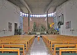 Das Innere der Kirche bildet ein trapezförmiger Saal, dessen seitliche Wände sich von 18 Metern Abstand am Eingang auf 14 Meter am Chor verengen und so eine zum Altar hin zielgerichtete Perspektive erzeugen. Nachgezeichnet wird dies durch die leicht gekrümmte von bogenförmigen Stützen getragene Decke, die sich über dem Altar hoch hinauf schwingt. Die Raumhöhe steigt vom recht niedrigen Eingangsbereich her bis zur konkav geschwungenen Abschlusswand des Altarraums aus rotem Naturstein kontinuierlich und stark an, was die Bedeutung des Altarraums entsprechend hervorhebt. Im Altarraum befinden sich links und rechts raumhohe Glasflächen und ein Fensterband direkt unter der Decke, die Licht in den Raum strömen lassen. Der Altar stand ursprünglich weiter hinten im Chorraum, wurde aber im Zuge der Liturgiereform des Zweiten Vatikanischen Konzils durch einen neuen kleineren ersetzt und weiter vorne im Kirchenraum platziert. Zwei Treppen führen links und rechts des Altars hinab in einen Raum, der früher als Taufkapelle genutzt wurde, aber ursprünglich als Krypta geplant war.[4]