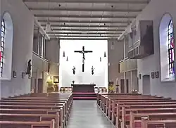 Das Kirchengebäude ist gegliedert in ein vierachsiges Langhaus, gefolgt von einem Querhaus, an das sich wiederum ein dreiseitiger Chorraum mit geradem Abschluss anschließt. Daraus ergibt sich die Form eines lateinischen Kreuzes als Grundriss. An der Stelle, an der der südliche Querhausarm vom Langhaus abzweigt ist der Kirchturm in den sich daraus ergebenden Winkel gestellt. In den Querhausarmen befinden sich Emporen. Eine weitere Empore ist über dem Eingangsportal angebracht.