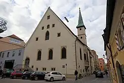 Die Kirche hat ihren Ursprung um 1445.[1] Das Kirchengebäude verdankt seine Entstehung der Gründung der Bruderhausstiftung, die 1444 durch die Vereinigung von zwei bürgerlichen, wohltätigen Stiftungen entstanden war. Vereinigt wurden die Stiftung des reichen Bürgers Stephan Notangst, der das sogenannte Bruderhaus am Haidplatz[2] für verarmte alte Handwerker zur Verfügung gestellt hatte, mit der Kastenmayer-Stiftung des reichen Bürgers Hans Kastenmeyer, der 1444 das Anwesen am Eck von Oberer Bachgasse und Emmeramsplatz aufgekauft hatte, um dort nach dem Umbau des Anwesens zum neuen Bruderhaus ebenfalls verarmte Handwerker unterzubringen. Unentgeltlich aufgenommen wurden Brüder, die zu leichten Arbeiten verpflichtet waren, während sich Pfründner einkaufen mussten und nicht arbeitspflichtig waren. Nach der Reformation 1542 wurde das Bruderhaus zu einer evangelischen Stiftung.