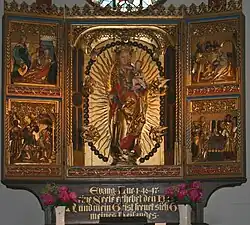 Zum Inventar gehört ferner ein spätgotischer Schnitzaltar von 1521 (Eiche, Maße des Mittelschreins: 202 × 144 × 27,5 cm).[2] Im Mittelschrein zeigt er eine Rosenkranzmadonna. Die Reliefs der Seitenflügel stellen Szenen rund um die Geburt Christi dar. In der Predella stehen mit Lk 1,46-47 Verse aus dem Magnificat. Das Retabel wurde vermutlich für die Marienkapelle, einen Anbau an der Südseite der Kirche, geschaffen und stammt aus demselben Werkstattumkreis, dem auch der Rosenkranzaltar aus dem Heiligen-Geist-Hospital in Lübeck (um 1525, als Dauerleihgabe im St. Annen-Museum, Inv. Nr. 1989/A1), das Laurentiusretabel der Bruderschaft der Bauernknechte aus der Burgkirche (1522, heute St. Annen-Museum, Inv. Nr. 2), das Jakobusretabel in Breckerfeld und eine Marienkrönung aus einem verloren gegangenen Retabel der Lübecker Jakobikirche (um 1515, ebenfalls St. Annen-Museum, Inv. Nr. 10) zugerechnet werden.[3][4][5] Gerade Ähnlichkeiten und Differenzen zwischen dem Gettorfer Werk und dem ikonographisch vergleichbaren Rosenkranzaltar im Heilig-Geist-Hospital werden diskutiert, da für letzteren begründet Einflüsse aus Hildesheim und sogar Mecheln vermutet werden.[6] Außerdem sind sowohl in Fragen der künstlerischen Herkunft als auch der Qualität der Schnitzarbeiten unterschiedliche Hände bei der Retabelfertigung zu scheiden.