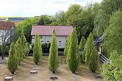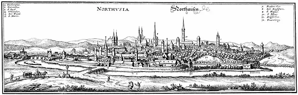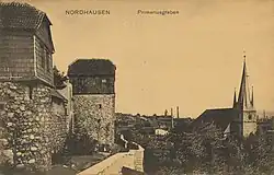 Nordhausen um 1640 (Merian). St. Jacobi mit Ziffer 3 im TurmStandort der ehemaligen St.-Jacobi-KircheBlick vom Primariusgraben auf das diakonische Pflegeheim St. Jakob Haus