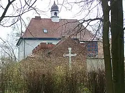 Das zweigeschossige, im Obergeschoss verputzte Gebäude ist eine Verbindung von Kirche und Wohnhaus und wurde 1926 als Missionshaus mit Kapelle gebaut. Es besitzt ein Walmdach und einen markanten Dachreiter mit Glockenstube und Glockenhaube. Das Untergeschoss mit einer Backsteinfassade wird durch die hohen rundbögigen Fenster und das Portal betont. An dem eingeschossigen Saalanbau dominiert das Kreuz an der Nordseite. Die bleiverglasten bunten Fenster stellen in neun Bildern das Glaubensbekenntnis dar. Das Fenster im Vorraum zeigt den Apostel Jakobus den Älteren (Jacobus Maior) als Schutzpatron der Kirche.