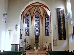 Der Wiederaufbau der Kirche begann im Jahr 1947. Bereits zum 1. Advent 1949 konnte das Gotteshaus wieder eingeschränkt genutzt werden. Vier Jahre später war auch der Turm rekonstruiert, und im Dezember 1957 kehrte die Orgel zurück.[10] Die baulichen Maßnahmen zogen sich in Teilen bis 1963 hin. Im Jahr 1975 wurde die historische Turmhaube restauriert. Im Rahmen der umfassenden Generalsanierung von 1988 erhielt der Chor eine markante Quadermalerei in Rot.