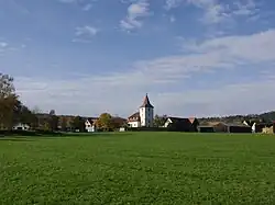 Die Kirche ist mit den sieben Bauernanwesen Häslabronns ensemblegeschützt.