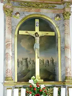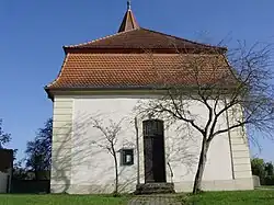 Von der spätgotischen Kirche hat sich der dreigeschossige Turm mit Gurtgesimsen und mit vierseitigem Pyramidendach erhalten.[8] In seinem Untergeschoss ist die Sakristei untergebracht, zu der eine Außentür an der Südseite des Turmes und zwei Türen beiderseits des Altars führen.