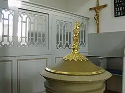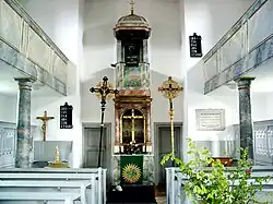 Dieser Abschnitt folgt im Wesentlichen Broser, S. 16–19, sowie Fehring, S. 100: Bei der Umgestaltung der Kirche im Jahr 1780 erhielt das Kirchenschiff eine hufeisenförmige, von toskanischen Rundsäulen getragene marmorierte Emporenanlage; auf der Westempore befindet sich die Orgel. In den nach oben erweiterten Chor im Turm wurde ein zweisäuliger Kanzelaltar aus Stuckmarmor eingepasst.[9] Hinter dem in einem Rundbogen (in den Zwickeln zwei Engelsköpfe) hängenden Altarkreuz des 18. Jahrhunderts zeigt ein einfaches Ölbild auf Holz die Mauern von Jerusalem in düsterer, zum Tod Jesu passender Atmosphäre. Die Zugangstür zur Kanzel über dem Altar ziert ein Gemälde mit dem Motiv des „Guten Hirten“.