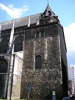 Die heutige spätgotische Kirche, deren Bau im Jahr 1538 abgeschlossen wurde, ersetzte die frühromanische Kirche. Das Gewölbe und seine Malereien stammen aus der gleichen Zeit, ebenso wie die Glasmalereien im Chor aus den Jahren 1525–1531. Das im Jahr 1558 hinzugefügte Renaissanceportal wird Lambert Lombard zugeschrieben. Die ursprüngliche Kirche hatte einen romanischen Vorbau und einen achteckigen Glockenturm aus der Zeit um 1170[2]. Nur der Vorbau mit einem der drei Türme ist erhalten geblieben.