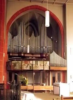 Die elektropneumatische Traktur und die Kegelladen wurden beibehalten, nur das neue Rückpositiv erhielt eine Schleiflade. Aufgrund dieses gemischten Systems, der ungünstigen Aufstellung und mangelnder Qualität des Materials zeigte sich die Orgel im Laufe der Jahre als störungsanfällig, was ständige Reparaturen und Dispositionseingriffe zur Folge hatte.[10] So wurde bei einem der vielen Umbauten das Rückpositiv vom dritten auf das erste Manual verlegt, sowie das Hauptwerk auf das zweite und das Schwellwerk auf das dritte, und die Orgel verfügt aktuell über 33 Register, verteilt auf drei Manuale und Pedal.[11] Außer Windverlust und starker Verschmutzung im Inneren konnten größere Funktionsausfälle bisher im Rahmen gehalten werden und das Instrument befindet sich heute in einem leidlich guten Zustand.[10]