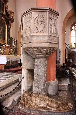 • Im Chor befindet sich das Epitaph des Sigmund Khevenhüller, eines Neffen des vorher erwähnten Sigmund Khevenhüller, von 1561 mit der lebensgroßen Darstellung eines Ritters in einer Nische mit gedrehten Säulen und wuchtigem Aufsatz mit Putto und Wappenschild. 1951 wurden Spuren der ursprünglichen Polychromierung aufgedeckt.