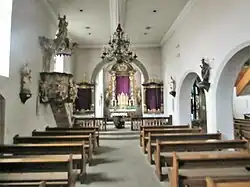 Der Hochaltar, der 1750 von Poppenhausen erworben wurde, und die beiden Seitenaltäre im alten Teil der Kirche sind zweisäulig aufgebaut. Die Rokoko-Kanzel mit Engelsputten wurde 1772 durch Paulus Zehr aus Bad Königshofen geschaffen. Auf der westlichen Empore steht eine kleine Orgel. Der Taufstein von 1571 steht im Übergangsbereich von der alten zur neuen Kirche.