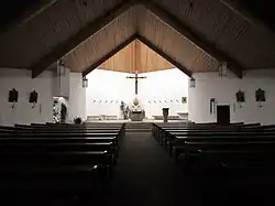 Der neue Kirchenbau mit innen sichtbarem zeltartigen Dach ist an die Südseite des Kirchenschiffs der alten Kirche quer zu diesem angebaut und durch offene Rundbögen mit dem alten Langhaus verbunden. Während die alte Kirche geostet ist, ist der neue Kirchenraum auf den Altar im Süden ausgerichtet. An der Südseite ist auch eine Sakristei mit eigenständigem Pyramidendach angebaut.