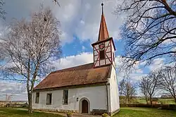 Die Saalkirche mit dreiseitigem Schluss des Chors wurde in der zweiten Hälfte des 16. Jahrhunderts über einem älteren Kern gebaut. Aus dem Satteldach des Langhauses erhebt sich im Westen ein quadratischer Dachreiter aus Holzfachwerk, der die Turmuhr und den Glockenstuhl beherbergt.