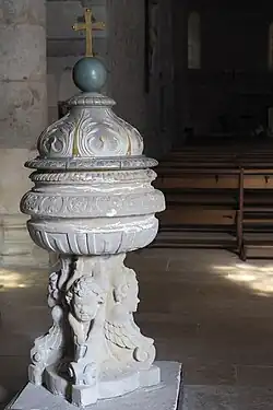 Das barocke Taufbecken aus Stein mit einer Abdeckung aus Holz steht auf einem Sockel mit vier Engelsköpfen. Das runde Becken aus dem 17. Jahrhundert ist mit einem Fries aus Blumenmotiven verziert und in der Wölbung godroniert. Im Jahr 1982 wurde es als Monument historique klassifiziert.[4]