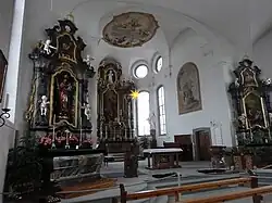 Der helle, festliche Innenraum wird durch Segmentbogenfenster im Kirchenschiff und einer zusätzlichen Reihe von Oculi im Chor beleuchtet. Gegliedert wird der Kirchenraum durch doppelte Pilaster ionischer Ordnung, von denen aus sich Stichkappen in Richtung Gewölbemitte ausdehnen. Der barocke Hochaltar stammt aus der Bauzeit, während Seitenaltäre und Kanzel 1938 als Ersatz für neuromanische Ausstattungsgegenstände des 19. Jahrhunderts aus dem Verenamünster in Zurzach übernommen wurden.