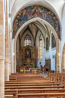 Es befinden sich etwa vierzig Bänke in der Kirche, die in zwei Bankreihen angeordnet sind. Die hinteren stehen auf einer Stufe, sind also etwas höher gelegen. Der Halter für die Kerzen der Verstorbenen steht (vom Haupteingang aus gesehen) meistens ganz hinten im linken Mittelschiff. Der Altar steht in der Mitte des Chores. An den Wänden des Chores steht das Chorgestühl, das heute von den Ministrierenden benutzt wird. Über der rechten Chorwand befinden sich zwei 1899 von den Gebrüdern Schiestl angebrachte Wandmalereien mit entsprechender (Textura-)Beschriftung. Das rechte von Rudolf Schiestl geschaffene Bild zeigt die „Rudolf-von-Habsburg-und-der-Priester“-Legende, nach der Rudolf von Habsburg auf der Jagd einem Priester sein Pferd schenkt. Dies ist eine Anspielung darauf, dass Rudolf von Habsburg das Dorf Germersheim 1276 in den Rang einer Freien Reichsstadt erhob (Näheres findet sich im Stadtartikel). Links davon ein Bild von Matthäus Schiestl, auf dem Kaiser Karl IV. den sieben Urvätern des Servitenordens die Urkunde zur Benutzung der Germersheimer Kirche als Kloster überreicht. Rechts neben dem Tabernakel befindet sich ein Kreuz mit einer Reliquie des heiligen Jakobus des Älteren, dem Namenspatron der Kirche. Aus dem Turm erklingt seit Beginn der 1950er-Jahre ein vierstimmiges Geläute bestehend aus drei Gussstahlglocken und einer historischen Bronzeglocke mit Schlagtonfolge cis1 - e1 - fis1 - gis1.