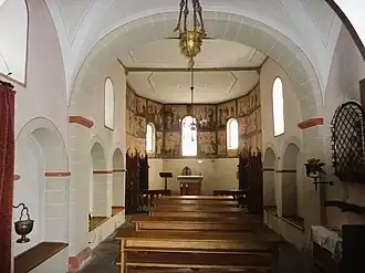 Der im Kern gewölbte, romanische Saalbau mit vorgesetztem Turm war ursprünglich im 12. Jahrhundert die Kapelle einer pfalzgräflichen Burg. Der Wandmalereizyklus von 1492 im dreiseitig geschlossenen Chor ist stark beschädigt. Es werden in zwei Reihen übereinander Szenen aus dem Leben Jesu und Darstellungen aus den Legenden der hl. Margareta und des hl. Jakobus gezeigt. Die Malereien wurden 1983/84 restauriert. Das ehemalige Kirchenschiff ist heute die Vorhalle einer neugotischen, zweischiffigen Backsteinhalle, die 1879/80 von Vincenz Statz errichtet wurde. Der Blockaltar aus dem 12. Jahrhundert wurde nachträglich versetzt.