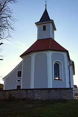 Die Saalkirche wurde 1730–31 erbaut. Sie besteht aus einem Langhaus und einem eingezogenen, dreiseitig geschlossenen Chor im Osten, aus dessen Dach sich ein quadratischer Dachreiter erhebt, der den Glockenstuhl mit zwei Kirchenglocken beherbergt,[1] und der mit einem Knickhelm bedeckt ist.