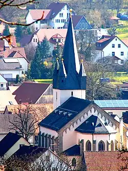 Die neugotische Saalkirche wurde unter Beibehaltung des Chorturms des Vorgängerbaus aus der ersten Hälfte des 15. Jahrhunderts nach einem Entwurf von Friedrich Kratzer unter Mitwirkung von Franz Josef von Denzinger 1884/86 erbaut. Sie besteht aus einem Langhaus aus fünf Jochen, einem eingezogenen, dreiseitig geschlossenen Chor im Westen mit der nach Süden angebauten Sakristei und dem Fassadenturm im Osten, dem ehemaligen Chorturm, dessen schiefergedeckter, achtseitiger, spitzer Helm und die Ecktürmchen jüngeren Datums sind. Die Wände des Langhauses und des Chors werden von Strebepfeilern gestützt. Das Langhaus überspannt eine Kassettendecke, den Chor ein Kreuzrippengewölbe.