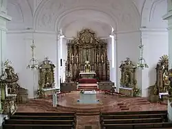 Der Innenraum vom Mittelschiff ist mit einem Tonnengewölbe überspannt, das mit Stuck verziert ist. Jedes Joch der Seitenschiffe ist mit einer Hängekuppel bedeckt. Von der Kirchenausstattung geht der Hochaltar auf die 1706 gebaute Vorgängerkirche zurück, der jedoch erweitert wurde. Über dem Tabernakel befindet sich ein Kruzifix. Seitlich stehen zwischen Säulen zwei Statuen von Heiligen. Der vom Freiherr von Frankenstein gestiftete Altar ist der heiligen Margareta geweiht.