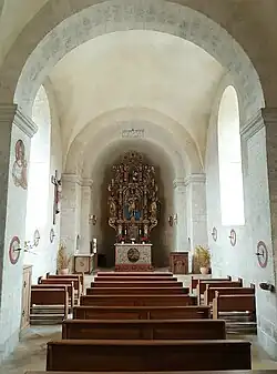 Den Zutritt ermöglicht ein schlichtes, zweistufiges Rundbogenportal auf der Südseite. Der zweijochige Innenraum ist ca. 18 m lang, 7,5 m breit und 8 m hoch und kreuzgratgewölbt. Die Gurtbögen ruhen auf rechteckigen Pfeilern. Die Apsis wird durch einen gestuften Rundbogen ausgeschieden.
