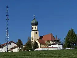 Die barocke Saalkirche wurde in den Jahren 1713 bis 1718 anstelle eines Vorgängers erbaut. Sie besteht aus dem Langhaus, dem eingezogenen, dreiseitig geschlossenen Chor im Osten, dem Kirchturm auf quadratischem Grundriss an der Südwand des Langhauses und der Sakristei in der Südostecke von Kirchturm und Chor. Der in den unteren Geschossen romanische Kirchturm wurde mit einem achteckigen Geschoss aufgestockt und mit einer Zwiebelhaube bedeckt.