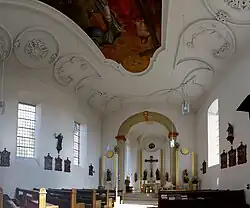 Die Kirche wurde in den Jahren 2010 und 2011 umgestaltet. Teile der barocken Ausstattung sind noch vorhanden. Am Hochaltar ist eine Kreuzigungsgruppe angebracht. Die Seitenaltäre besitzen Figuren des Kirchenpatrons (links) und der Muttergottes (rechts). Das Deckengemälde stellt die Himmelfahrt Mariens dar. Die Orgel geschaffen 1970 von der Orgelbaufirma Hey Orgelbau hängt an der westlichen Wand. Die Kirche verfügt über ein vierstimmiges Mollgeläut mit den Tönen es′, ges′, as′ und b′. Die Glocken wurden im Jahr 1949 von der Glockengießerei Grüninger in Neu-Ulm gegossen.[1]