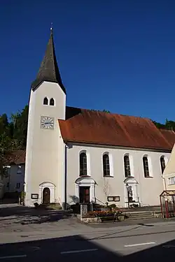 Die barocke Saalkirche wurde unter Verwendung des spätgotischen, auf romanischen Grundmauern basierenden Kirchturms im Osten errichtet und um 1725 umgestaltet. Das mit einem Satteldach bedeckte Langhaus hat im Westen einen eingezogenen, dreiseitig geschlossenen Chor. Der Kirchturm, der die Turmuhr und hinter den spitzbogigen Klangarkaden den Glockenstuhl beherbergt, ist mit einem spitzen Helm bedeckt, der mit Schindeln verkleidet ist. An der Nordseite des Kirchturms und des Langhauses befindet sich je ein Portal.