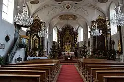 Der Innenraum des Langhauses ist mit einem Stichkappengewölbe überspannt, der des Chors mit einem Kreuzgewölbe. Die Deckenmalerei im Chor wird Otto Gebhard zugeschrieben. Zur Kirchenausstattung gehört ein Hochaltar, der von je zwei Säulen flankiert wird. An der Kanzel befinden sich Reliefs mit der Darstellung der Taufe Jesu und des Guten Hirten. Auf dem Schalldeckel befindet sich eine Darstellung des Jüngsten Gerichts, das von den vier Evangelisten umgeben ist.