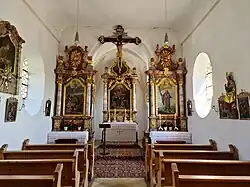 Das Langhaus ist mit einer Flachdecke überspannt, der Chor mit einem Sterngewölbe. Das Altarblatt des Hochaltars zeigt die Heiligen Augustinus von Hippo und Jakobus den Älteren, die der Gottesmutter Maria mit dem Jesuskind huldigen.
