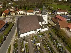 Die spätromanische Saalkirche wurde im 13. Jahrhundert erbaut. Ihr Chorturm mit der halbrunden Apsis im Osten blieb im Wesentlichen erhalten. Ihm wurde jedoch in späteren Zeiten eine schiefergedeckte Welsche Haube aufgesetzt. Das mit einem Satteldach bedeckte Langhaus im Westen wurde 1975/76 abgerissen und durch einen modernen Neubau ersetzt. Zur barocken Kirchenausstattung gehört ein Hochaltar mit einem Marienbildnis im Altarretabel. Die beiden von Johann Thomas Wagner gebauten Seitenaltäre, die aus der Wallfahrtskirche Maria Limbach stammen, wurden erst im Jahre 1752 aufgestellt.