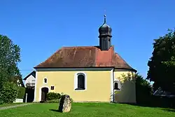 Die Saalkirche wurde 1683 anstelle eines kleineren Vorgängerbaus errichtet. Sie besteht aus einem Langhaus und einem eingezogenen, halbrund geschlossenen Chor. Aus dem Dach des Langhauses erhebt sich im Osten ein sechseckiger Dachreiter, der den Glockenstuhl beherbergt und der mit einer Zwiebelhaube bedeckt ist.