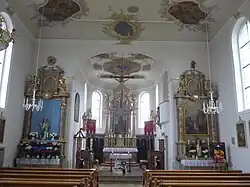 Der Innenraum des Langhauses ist mit einer Flachdecke überspannt. Die Fresken, im Chor mit dem Kirchenpatron, im Langhaus mit der Schlacht von Clavijo, wurden 1752/53 von Franz Martin Kuen eingebracht. An der Brüstung der unteren Empore im Westen wurden der Salvator mundi und die Apostel dargestellt. Der Hochaltar von 1756 wird von den Statuen des Simon Petrus und des Paulus von Tarsus flankiert.