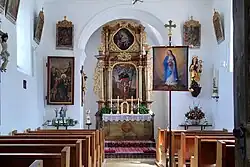 Zur Kirchenausstattung gehört ein Hochaltar vom Ende des 17. Jahrhunderts. Mittelpunkt des Altarretabels ist ein Gemälde, das den Kirchenpatron Jakobus mit Pilgerstab und Heiligenschein zeigt, über ihm ein Engel, der ihm den Lorbeerkranz aufsetzt und den Palmzweig als Zeichen des Märtyrers bringt. Im Hintergrund ist die Enthauptung des Heiligen zu sehen. Die Enthauptung ist ebenfalls auf einem Tafelbild an der Wand links vom Chorbogen dargestellt. Dieses Gemälde stammt von einem Flügelaltar. Der Altarauszug enthält ein Gemälde der Heiligen Familie mit Johannes dem Täufer, wie Jesus als Kind. Eine um 1500 gestaltete Mondsichelmadonna rechts vom Durchgang zum Chor wurde im 19. Jahrhundert erneuert.