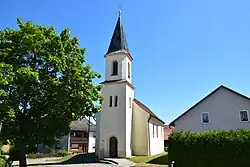 Die im Kern mittelalterliche Saalkirche wurde im 17. Jahrhundert umgebaut. Sie besteht aus dem Langhaus, dem eingezogenen Chor im Osten und der Sakristei an der Nordwand des Chors. Der mit einem spitzen Helm bedeckte Kirchturm auf quadratischem Grundriss im Westen, in dem sich das Portal befindet, wurde erst im 19. Jahrhundert angebaut. In seinem achteckigen Obergeschoss hängen zwei Glocken.[1]