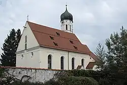 - In den viersäuligen Hochaltar von 1823 ist das Altarblatt des barocken Vorgängeraltars integriert. Es wurde 1697 von dem Augsburger Kirchenmaler Johann Georg Melchior Schmidtner ausgeführt und stellt die Heilige Familie und Johannes den Täufer mit den Tempeldienern Hannah und Simeon dar.