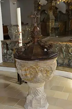 Eine geschnitzte Johannes-Schüssel aus der Zeit um 1500 ist an der Südwand des Chores zu sehen. Am Chorbogen ist ein Kruzifix aus der Zeit um 1520 angebracht. An den Pfeilern sind etwa lebensgroße Figuren der heiligen Johann Baptist, Florian, Jakobus und Barbara von Doser aus dem Jahr 1728 zu sehen. Neben den östlichen Seitenaltären sind Figuren der Heiligen Michael und Johann Nepomuk aus der Zeit um 1730 aufgestellt, deren originale Fassung 1978 freigelegt wurde.