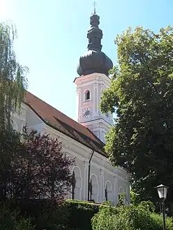 Auf der Westseite ist ein Spindelhelmturm mit Laterne angebaut, der ein typisches Merkmal der Barockkirchen im Erdinger Land ist. Der dreigeschossige Turm über quadratischem Grundriss wird durch Pilaster und Lisenen an den Kanten gegliedert und besitzt weit auskragendes, profiliertes Gebälk als Geschosstrennung. Das obere Geschoss, welches Glockenstuhl, Schallöffnungen und Turmuhr enthält, besitzt abgeschrägte Ecken. Auf der Südseite des Chores ist die zweigeschossige Sakristei angebaut.