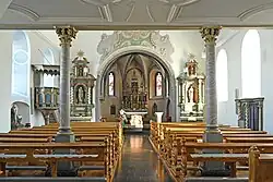 Im Innenraum haben sich eine barocke Kanzel, sowie zwei einfache barocke Nebenaltäre erhalten. Im Chor befindet sich ein neugotischer Hochaltar aus der Zeit zwischen 1900 und 1910, sowie ein am 22. Dezember 1979 konsekrierter moderner Volksaltar. Außerdem haben sich im Chor zwei Buntglasfenster mit Darstellungen des hl. Petrus und des hl. Paulus, welche um 1900 von der Firma Reuter und Reichart geschaffen worden sind, erhalten.[3]