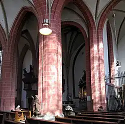 1968 wurde Kirche St. Johann Baptist renoviert und farblich neu gefasst. Der fast quadratische Grundriss des Gebäudes umschließt ein Gebilde aus neuen Raumkompartimenten. Zwei Joche einer dreischiffigen spätgotischen Halle, den quadratischen Chor und den südlichen Nebenchor, sowie dem nördlichen Durchgangsraum mit der Orgelempore. In der Halle wechseln die Schiffsbreiten vom Gleichmaß im Westen über trapezförmige Übergangsraumteile zu einem Chorjoch. Bei dem gleichmäßigen Westjoch handelt es sich an sich um ein Turmjoch, die ist im Innenraum nicht erkennbar, weil die Masse des wuchtigen, mit einem hohen Spitzhelm bekrönten Turmes ohne Veränderungen der Gewölbehöhe auf Freipfeiler abgeleitet wird.[3]