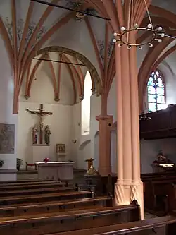 Sehenswert sind im Innern die Schlusssteine der Gewölbe. Sie stellen unter anderem den hl. Eligius, ein Wappen, Maria mit Jesukind, den Pfarrpatron Johannes der Täufer und den hl. Sebastian dar. Des Weiteren befindet sich ein Wandgemälde aus dem 16. Jahrhundert in der Kirche. Es zeigt den Kampf des hl. Georg gegen den Drachen. Auch zu sehen ist ein Relief mit Darstellung des Gleichnisses der klugen und törichten Jungfrauen. Die Fenster schuf der Glasmaler Wilhelm de Graaff um das Jahr 1952.[2]