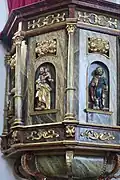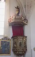 An der Südwand ist die barocke Kanzel angebracht. Auf dem Kanzelkorb sind die Figuren der vier Evangelisten (v.l.n.r) Markus, Matthäus, Lukas und Johannes. Diese haben eine Lüsterfassung. Auf dem Schalldeckel steht Christus als Salvator mundi.