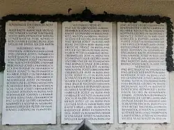 An der Südwand der Kirche ist in einer Nische zwischen der Sakristei und der Vorhalle das Kriegerdenkmal von Oberwarngau. Auf den drei Tafeln sind die Namen der Opfer der Sendlinger Mordweihnacht 1705, des I. Weltkriegs 1914–1918 und des II. Weltkriegs 1939–1945 angebracht.[9]