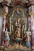 Der jetzige Hochaltar stammt aus dem Jahr 1865. In ihm sind Teile des barocken Altars verwendet worden.[12] In der Mitte der Kirchenpatron Johannes der Täufer mit dem Lamm und zu beiden Seiten St. Sebastian und St. Christophorus. Im oberen Bereich steht der Gute Hirte. Der Hochaltar ist ein Wandelaltar. Im Laufe des Jahres werden im Mittelfeld das Gemälde und die Figuren ausgetauscht. Zur Weihnachtszeit ist die Heilige Familie vor einem gemalten Krippenhintergrund, in der Karwoche bis Gründonnerstag ist Jesus am Ölberg mit dem Engel, der ihm den Kelch des Leidens bringt, am Karfreitag sind die drei Kreuze auf Golgotha, in der Osterzeit ist der auferstandene Heiland und während der restlichen Zeit im Jahreskreis ist der Kirchenpatron Johannes der Täufer zu sehen.[13]