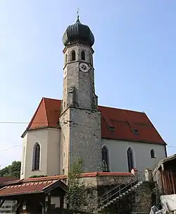 Die Kirche in ihrer heutigen Form und Gestalt wurde um 1500 vom Tegernseer Klosterbaumeister Alexander Gugler im Stil der Spätgotik errichtet.[5] Vor dieser Kirche dürften mehrere Bauten an diesem Platz vorausgegangen sein. Diese Vorgängerbauten sind als Bodendenkmal D-1-8136-0022 in der Denkmalliste eingetragen.[6]