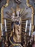 Der linke Seitenaltar ist der Mutter Gottes geweiht. Auf ihm steht eine 1,05 m große Marienfigur aus der 1. Hälfte des 16. Jahrhunderts. Im Glasschrein unten eine liegende Figur des heiligen Johannes Nepomuk. Links steht die heilige Helena, rechts die heilige Barbara. Oben unter dem Baldachin eine weitere Marienfigur mit Jesukind.