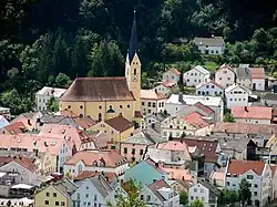 Bereits seit dem 13. Jahrhundert ist an der Stelle der heutigen Stadtpfarrkirche eine kleinere Kirche nachgewiesen, die seit jeher Johannes dem Täufer (Gedenktag: 24. Juni) geweiht war. Der Bau der heutigen, spätbarocken Kirche unter Einbeziehung des mittelalterlichen Turmes erfolgte im Jahr 1739. Der Baumeister ist unbekannt; jedoch spricht die Gesamtheit der Stilelemente für den Landshuter Hofmaurermeister Johann Georg Hirschstötter, der diese acht Jahre später beim Bau der Pfarrkirche St. Andreas in Hofendorf in noch konzentrierterer Form angewendet hat.[2][3]