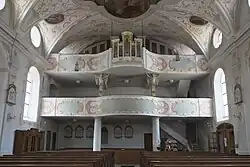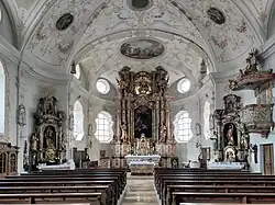 Aufgrund der großzügigen Breite des Kirchenbaus und der zahlreichen Fenster mit schrägen Gewänden, mit denen wie auch mit dem Solnhofener Plattenkalk als Bodenbelag eine Streuwirkung des Lichts erzielt wird, macht der Innenraum einen weiten und lichten Eindruck. Er ist von einem flachen Tonnengewölbe mit Stichkappen überspannt, das als sogenanntes Schalgewölbe über eine Holzkonstruktion am Dachstuhl aufgehängt ist. Es entspringt aus einem rundum laufenden, profilierten Kranzgesims, das wiederum auf flachen Pilastern abgestützt ist, welche zugleich die Jochgliederung übernehmen. Der Altarraum ist lediglich um eine Stufe erhöht und durch einen kaum merklichen, aufgrund der Gewölbeform gedrückten Chorbogen vom Langhaus abgesetzt. Im rückwärtigen Halbjoch des Langhauses ist eine Doppelempore eingezogen. Deren unteres Geschoss ruht auf Rundsäulen; das obere Geschoss, auf dem die Orgel steht, wird von verputzten, rechteckigen Holzpfeilern mit Karyatidenengeln getragen. Die Brüstungen beider Emporengeschosse sind in der Mitte nach vorne gewölbt.[3]