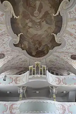 Seitenwände und Decke sind mit spätbarocken Stuckornamenten in Pastelltönen auf weißem Kalkgrund verziert, die in ihren Formen teilweise bereits auf das beginnende Rokoko verweisen. Hauptelemente sind Bandelwerk, Akanthusrankwerk, Muschelwerk, Blütengehänge, Rosetten, asymmetrisch berandete Kartuschen, Drachenkämme und Lambrequins. In den Stichkappen ist der Stuck als illusionierte Brokatstoffe modelliert, die Kanten der Stichkappen sind von Profilstuckleisten eingerahmt. Am Chorbogen befindet sich ein geschwungenes Spruchband mit der Aufschrift „VIDI SPIRITUM DESCENDENTEM QUASI COLUMBAM DE COELO“ (Ich sah den Geist vom Himmel heruntersteigen wie eine Taube, Joh 1,32 ).[5]