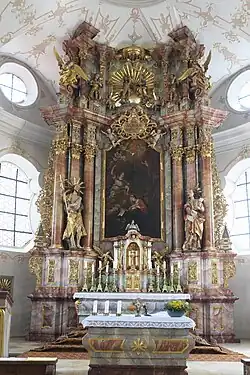 Flankiert wird das Altarblatt von den lebensgroßen Statuen von Johannes dem Täufer (links) und dem Evangelisten Johannes (rechts), die jeweils zwischen den Säulen auf dem oberen Sockel stehen. Sie werden dem Bildhauer Georg Wallner aus Parsberg in der Oberpfalz zugeschrieben. Johannes der Täufer hält in seiner rechten Hand den Kreuzstab mit der Inschrift „ECCE AGNUS DEI“ (Seht das Lamm Gottes) und blickt nach oben in die göttliche Zone am Altarauszug. Der Evangelist Johannes trägt als Attribute den Kelch mit der herauszüngelnden Schlange und das Evangeliar; er blickt auf die Maria im Hauptbild. Seitlich außen befinden sich zwei kleine Reliquienpyramiden, darüber sind an den Seiten des Altaraufbaus geschnitzte und vergoldete Akanthuswangen angebracht.