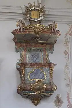 Die Kanzel in üppigen Rokokoformen wird in die Mitte des 18. Jahrhunderts datiert; der Urheber ist wie bei den Altären unbekannt. Der geschwungene Kanzelkorb, der an den Kanten mit Pilastern besetzt ist, trägt an der Vorderseite eine Rocaille-Kartusche mit der Inschrift „VERBUM DEI“ (Wort Gottes). Auf der Unterseite des Schalldeckels ist die Heilig-Geist-Taube im Relief dargestellt; obenauf flankieren zwei Putti die mit einem Wolken- und Strahlenkranz hinterlegten Gesetzestafeln des Alten Testaments.[7]